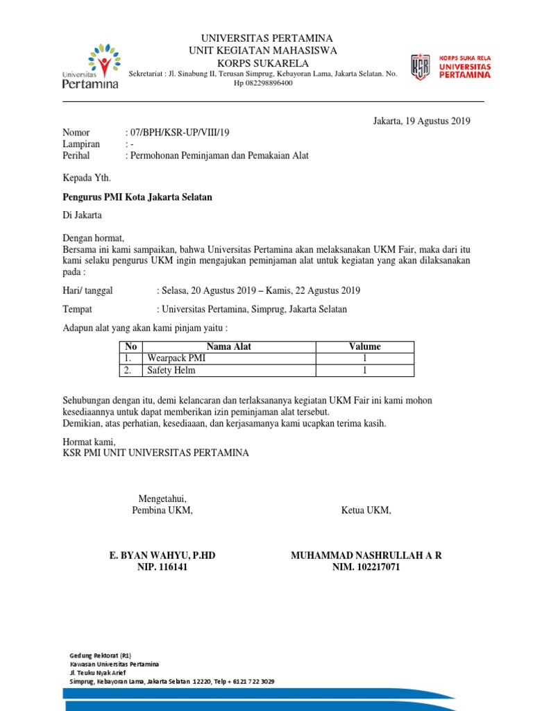 Surat peminjaman alat d panitia pembangunan pondok pesantren sekretariat. Kepala sekolah smp muhammadiyah 1. Apabila pengembalian melebihi batas waktu yang diberikan tanpa adanya konfirmasi ke asisten laboratorium maka akan dikenal.
