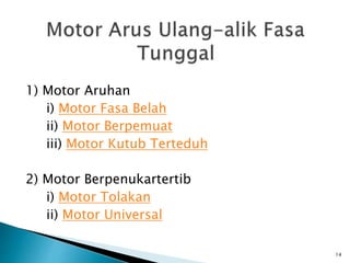 LnP0101 Prinsip Kendalian Motor Fasa Tunggal Disediakan oleh. Pensyarah menerangkan prinsip kendalian Motor Fasa Tunggal 1 Dalam motor AU elektromagnet digunakan dan gegelung angker disambung kepada gelang-gelang berbelah komutator. KELEBIHAN DAN KEKURANGAN MOTOR ARUS ULANG ALIK FORMULA MOTOR AU FASA TUNGGAL MOTOR ARUS ULANG ALIK SATU FASA BAHAGIAN-BAHAGIAN UTAMA MOTOR AU Kehilangan Kuasa I2R Kuasa Keluaran Po Kuasa keluaran 746 watt Kuasa Masukkan Pi VL x IL x Cos q watt Faktor Kuasa.