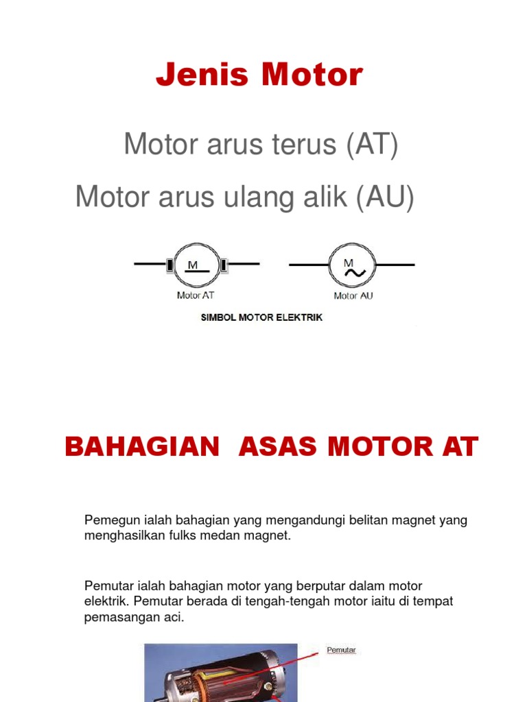 Motor AU terdiri daripada motor AU fasa tunggal dan motor AU tiga fasa. Secara umumnya motor elektrik mempunyai sepasang medan magnet gegelung konduktor berus karbon dan bekalan kuasa arus terus. Slide 3 arus yang mempunyai magnitud arah pengalirannya dalah yang tetap ataupun berubah- sehala ubah arus terus boleh diperolehi daripada bekalan arus ulang-alik boleh ditukar kepada arus dengan menggunakan diod ulang-alik dengan atau rektifier yang menggunakan inverter.